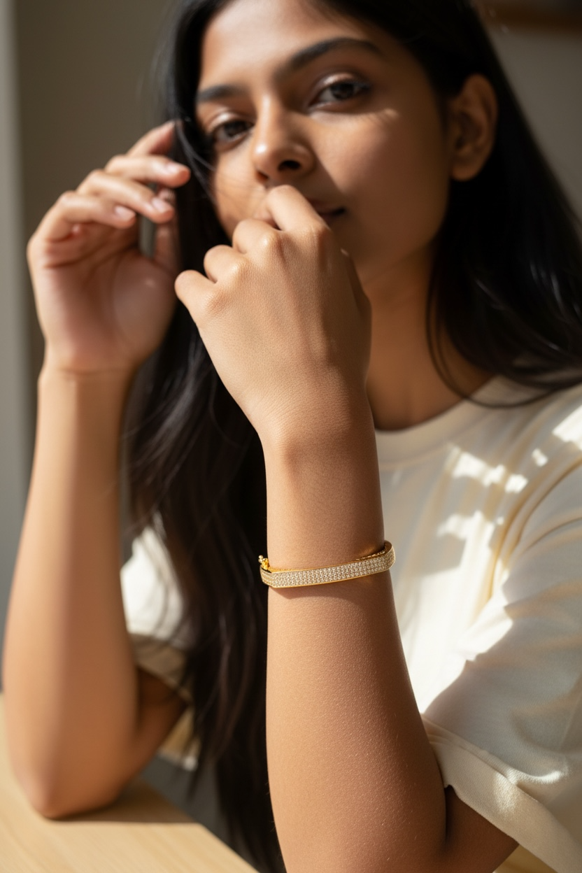 Elevate your jewellery collection with this stunning Gold Square Pavé Bangle, crafted with a sleek, structured silhouette and rows of dazzling zirconia stones. The modern square design gives it a refined, designer-inspired feel, while the 18K gold electroplating adds long-lasting shine.